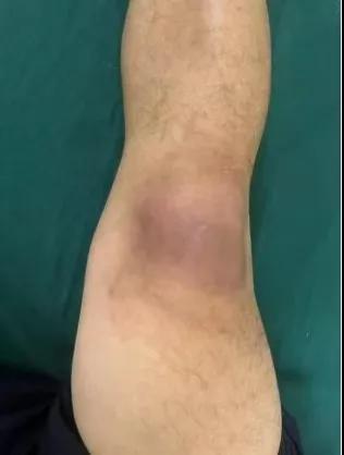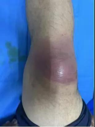 患者,以“外傷致右膝紅腫、疼痛20余天”為主訴就診,20余天前,因騎電車摔傷右膝關(guān)節(jié),致使出現(xiàn)右膝腫脹、疼痛、活動(dòng)受限,在當(dāng)?shù)蒯t(yī)院給予消腫、止痛治療效果差,繼而出現(xiàn)膝關(guān)節(jié)紅腫熱痛癥狀,門診給予滑膜炎片及消腫止痛藥物治療癥狀未見好轉(zhuǎn),慕名前來我院手顯微外科住院。入院當(dāng)天即給予中藥外敷(骨炎膏),穿刺膿性分泌物送細(xì)菌培養(yǎng),給予廣譜抗生素治療(細(xì)菌培養(yǎng)未出)。