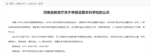 剛剛,河南省教育廳發(fā)布關(guān)于申報(bào)設(shè)置本科學(xué)校的公示,其中提到,省教育廳對
