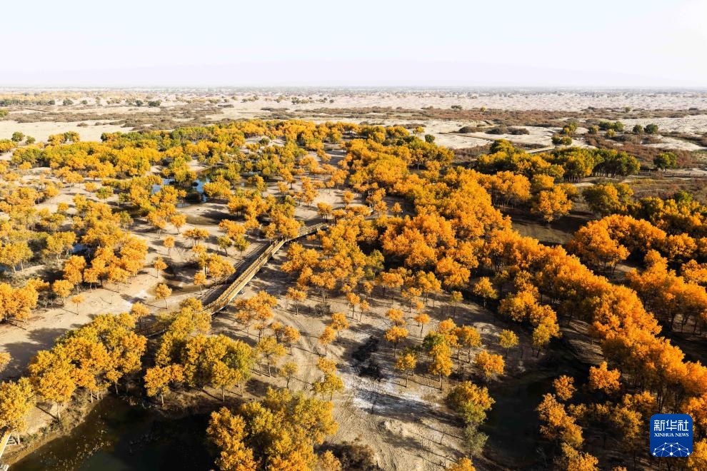 在新疆和田地區(qū)和田縣翡翠湖,成片胡楊林坐落其中(無人機(jī)照片,10月20日攝)。